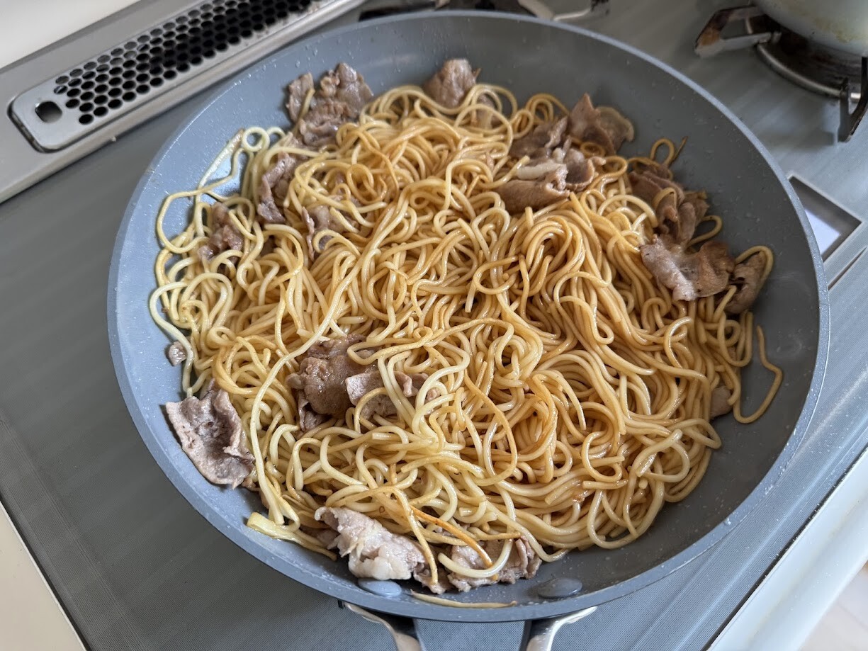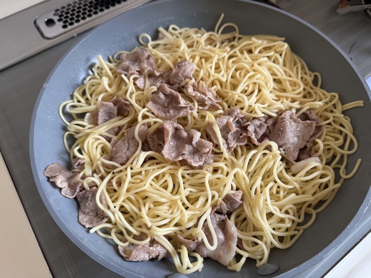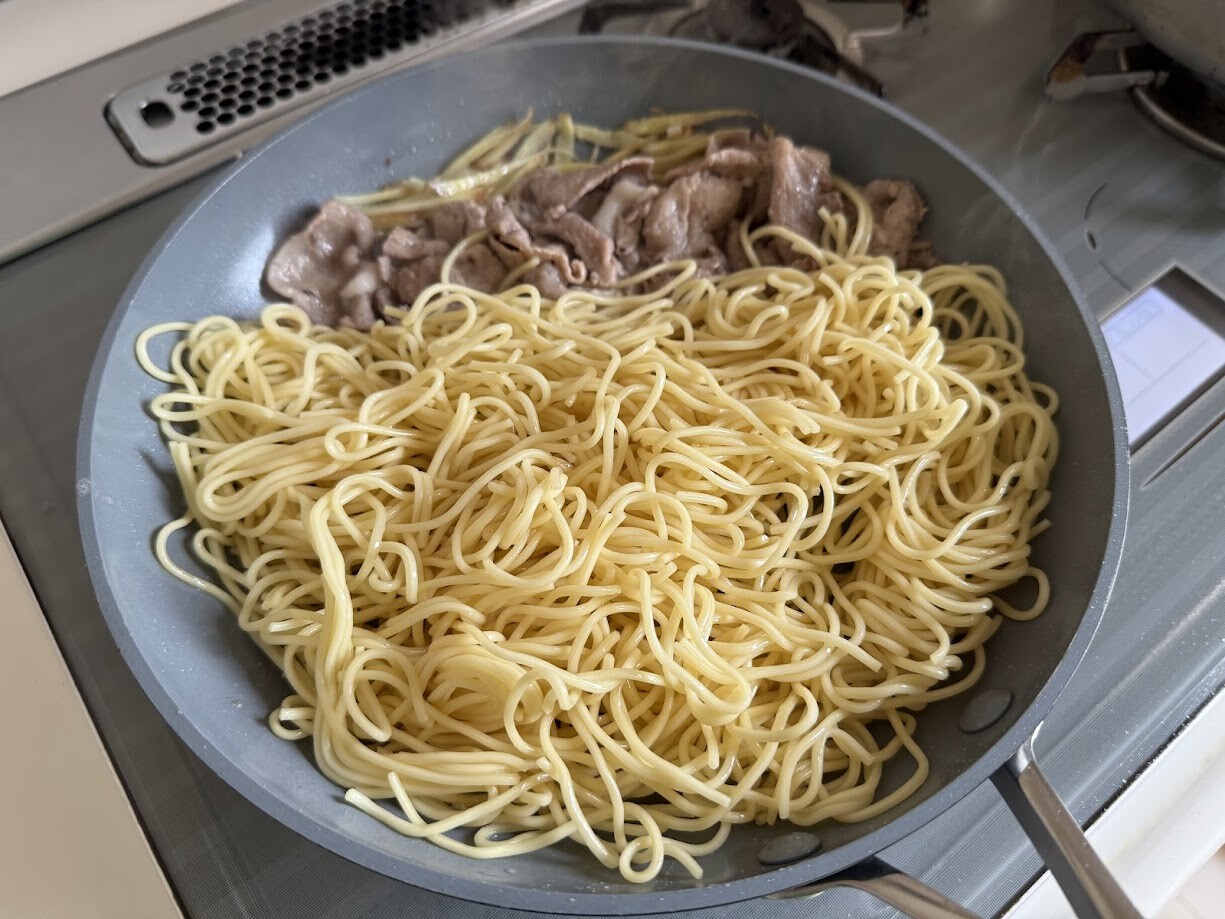 肉に火が通ったら、一旦向こうに追いやって、麺を炒めます。