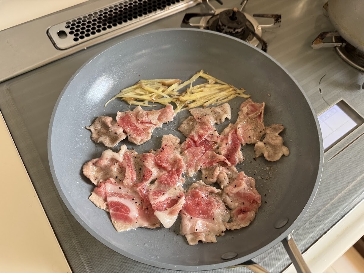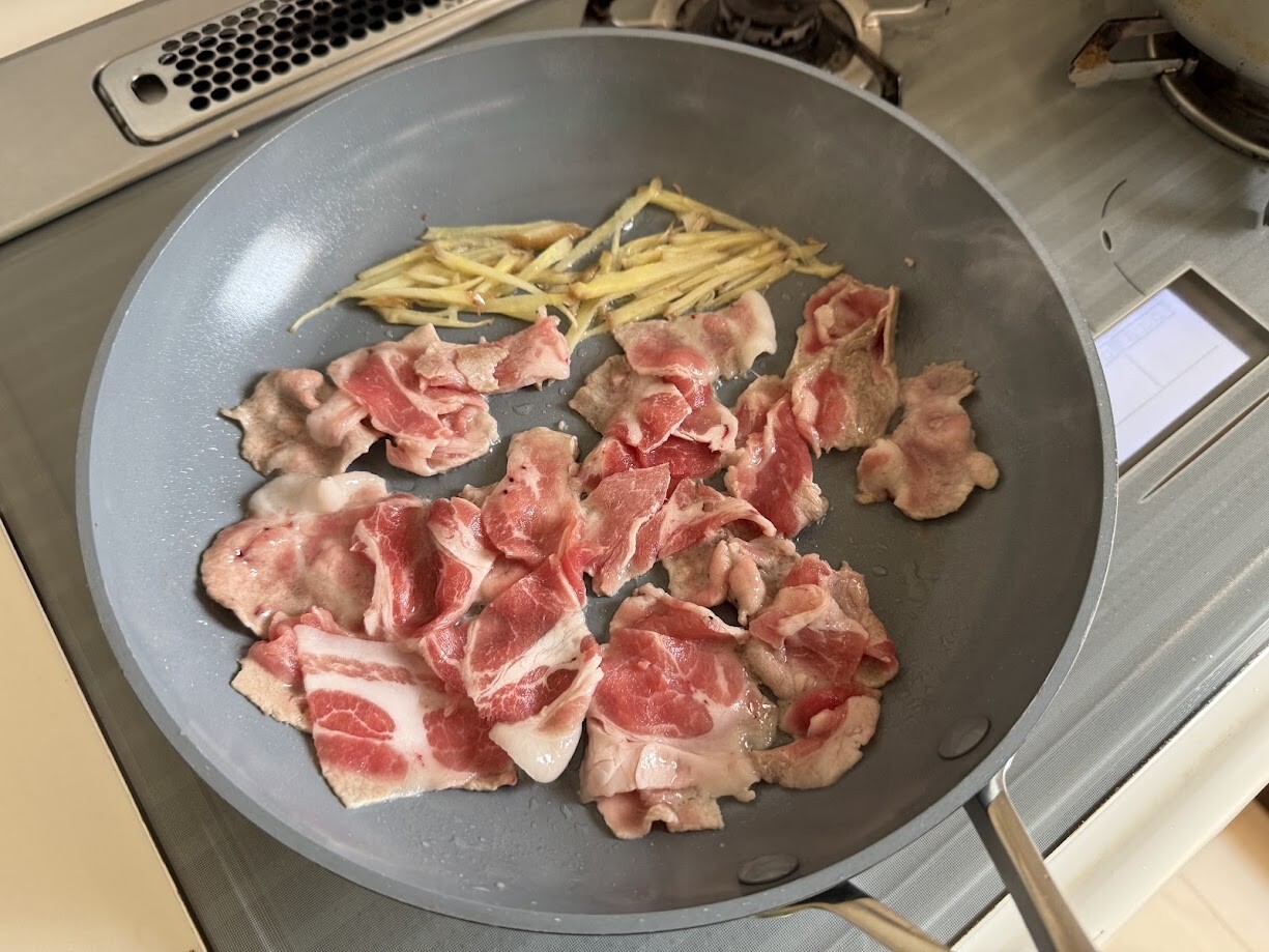 生姜を奥で炒めつつ、手前に豚肉を広げて。