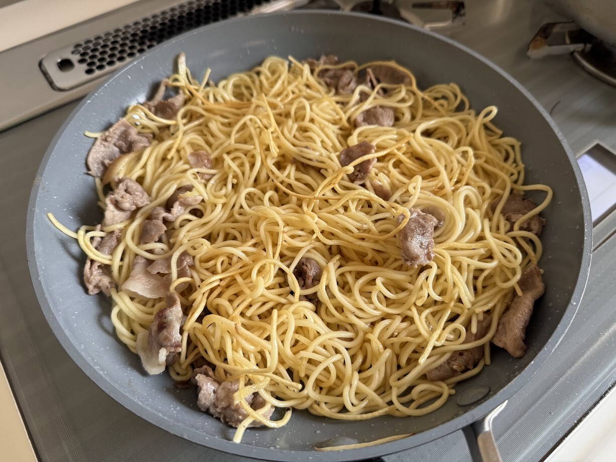 5分後、麺を裏返すと、こんな感じで麺がところどころパリッと香ばしく焼けています。