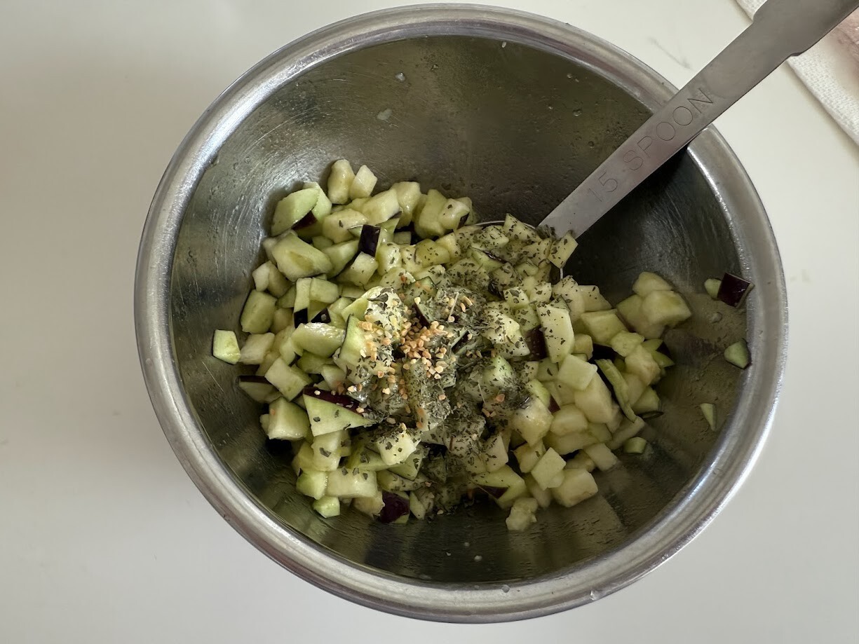 水ナスは刻んで、塩、ブラックペパー、あらびきガーリック、ドライバジル、レモン汁、オリーブオイルを混ぜただけ。