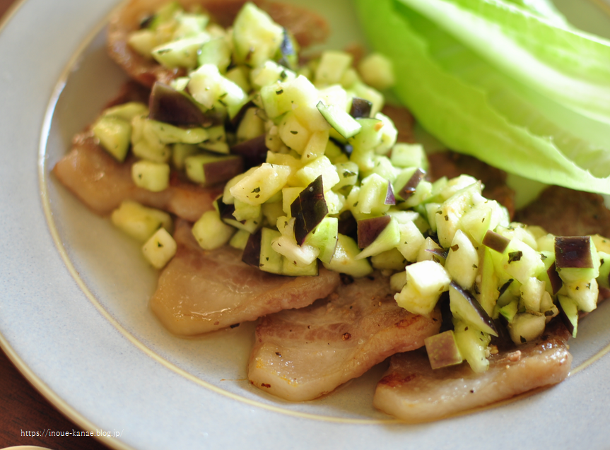 *豚肩ロースの焼き肉に水ナスのマリネのっけ