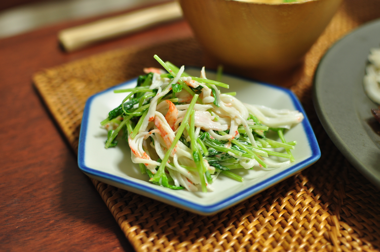 豆苗を3等分の長さくらいにカットしてレンジで1分ほど加熱し、水気が出ていたら拭いて、軽く塩。