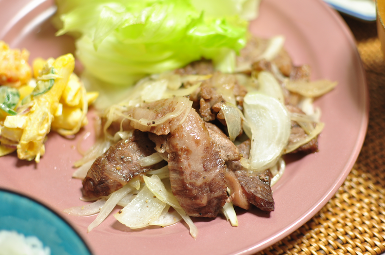 塩、ブラックペパーを振った牛肉を焼き付けて、時間差で玉ねぎの薄切りを加えてシャキッと炒め、お皿へ。