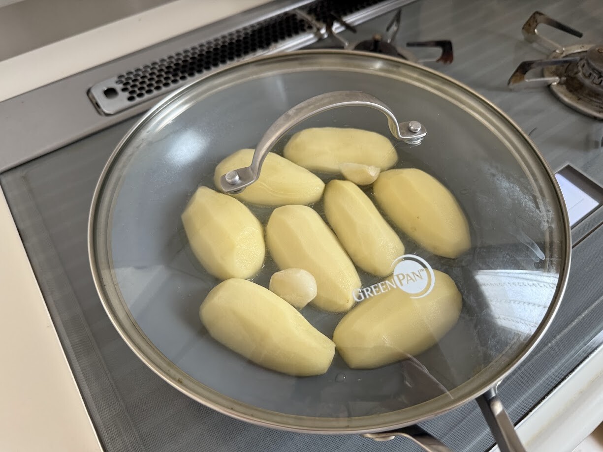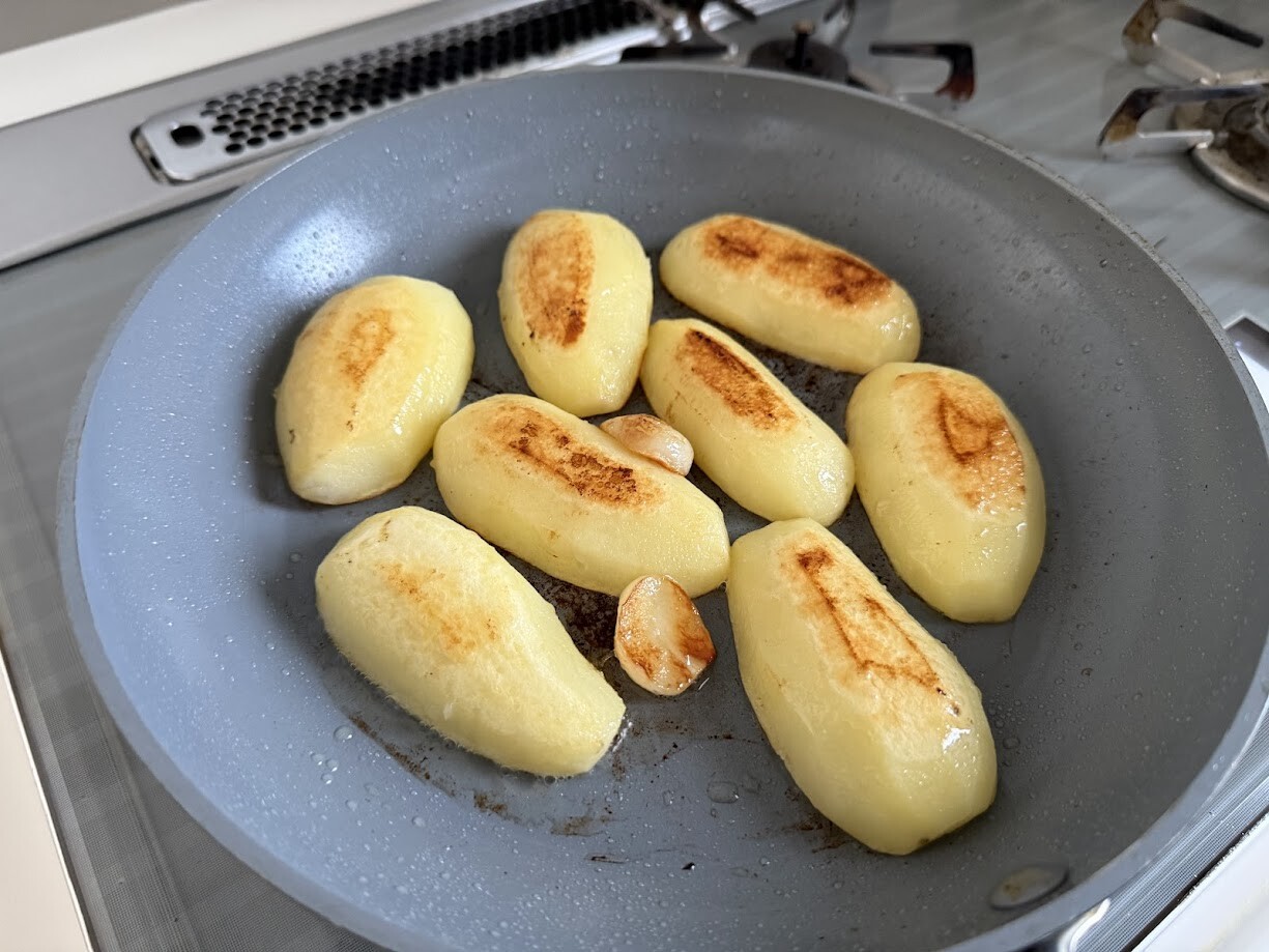 ジャガイモ(うちはメークインが多い)の厚みを半分にする感じで2等分に切ったものを、フライパン+蓋でニンニクと一緒にじっくり蒸し焼きにして