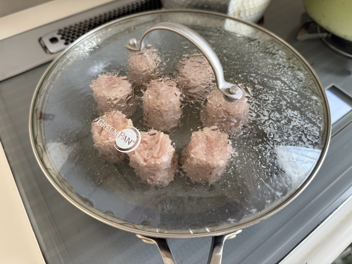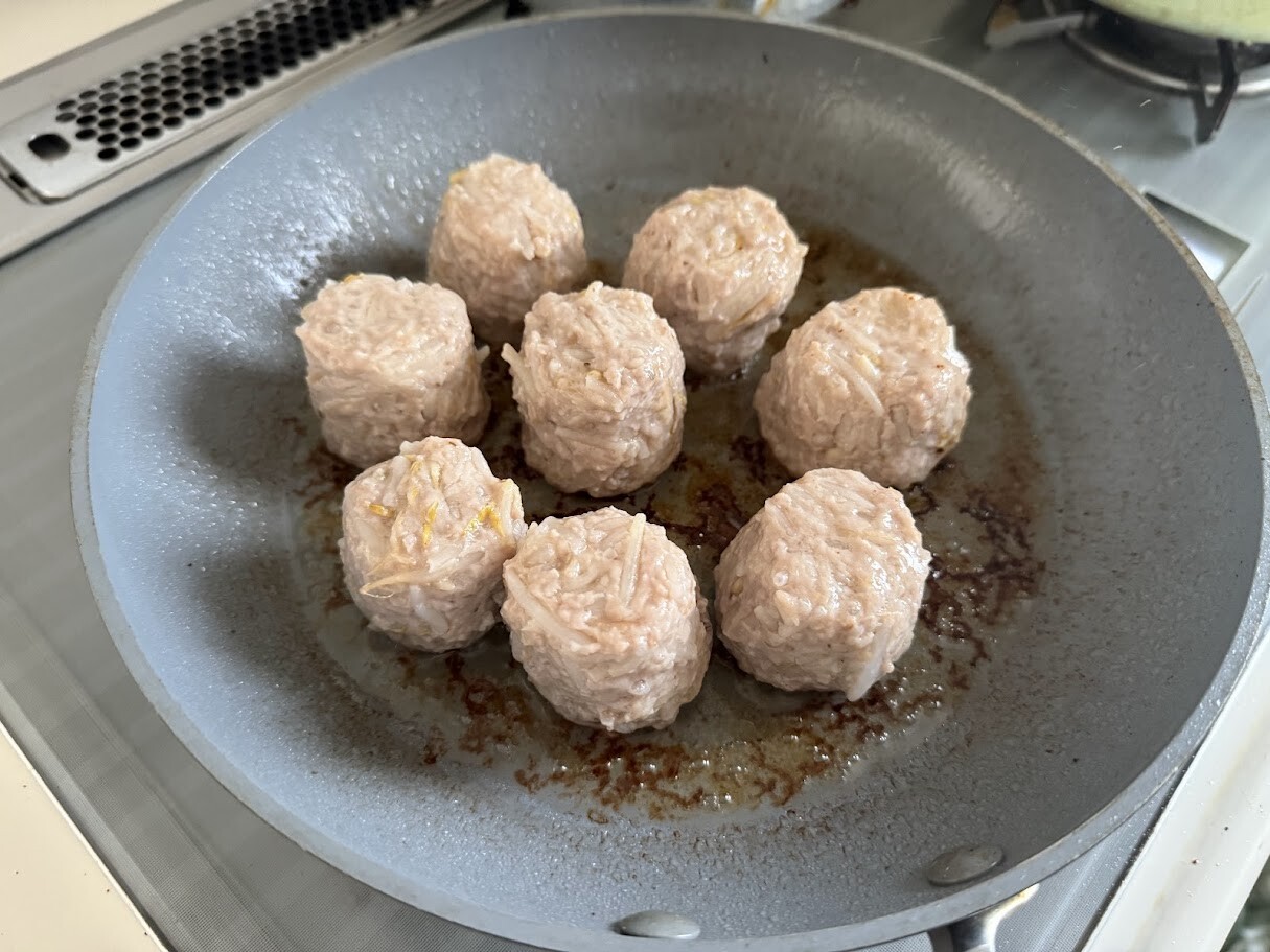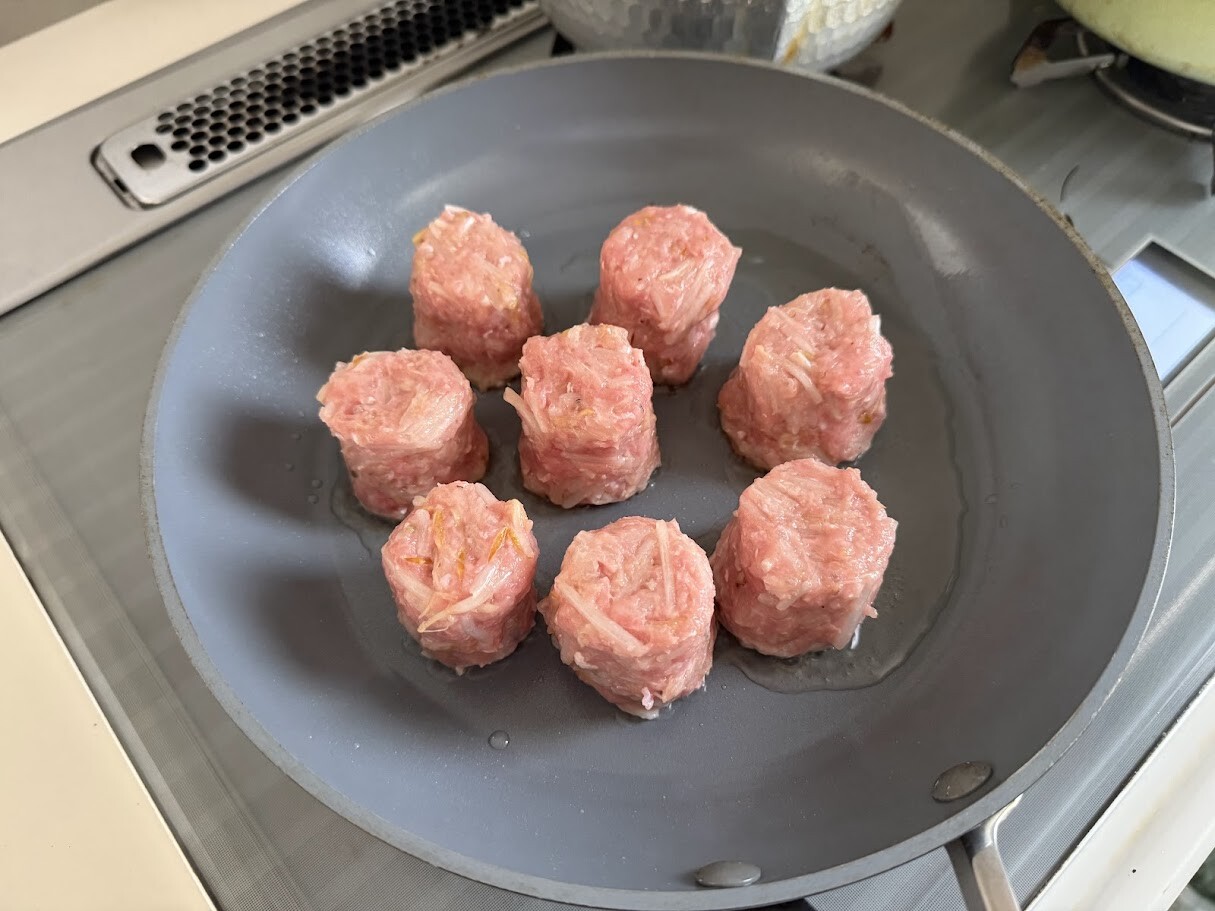 いかにもシュウマイですけど?みたいな顔をして並べられていますが、シュウマイの皮は使っていなくてしかも2人前でもやしを1袋使っているという、意外にヘルシーなシュウマイ風の肉団子。