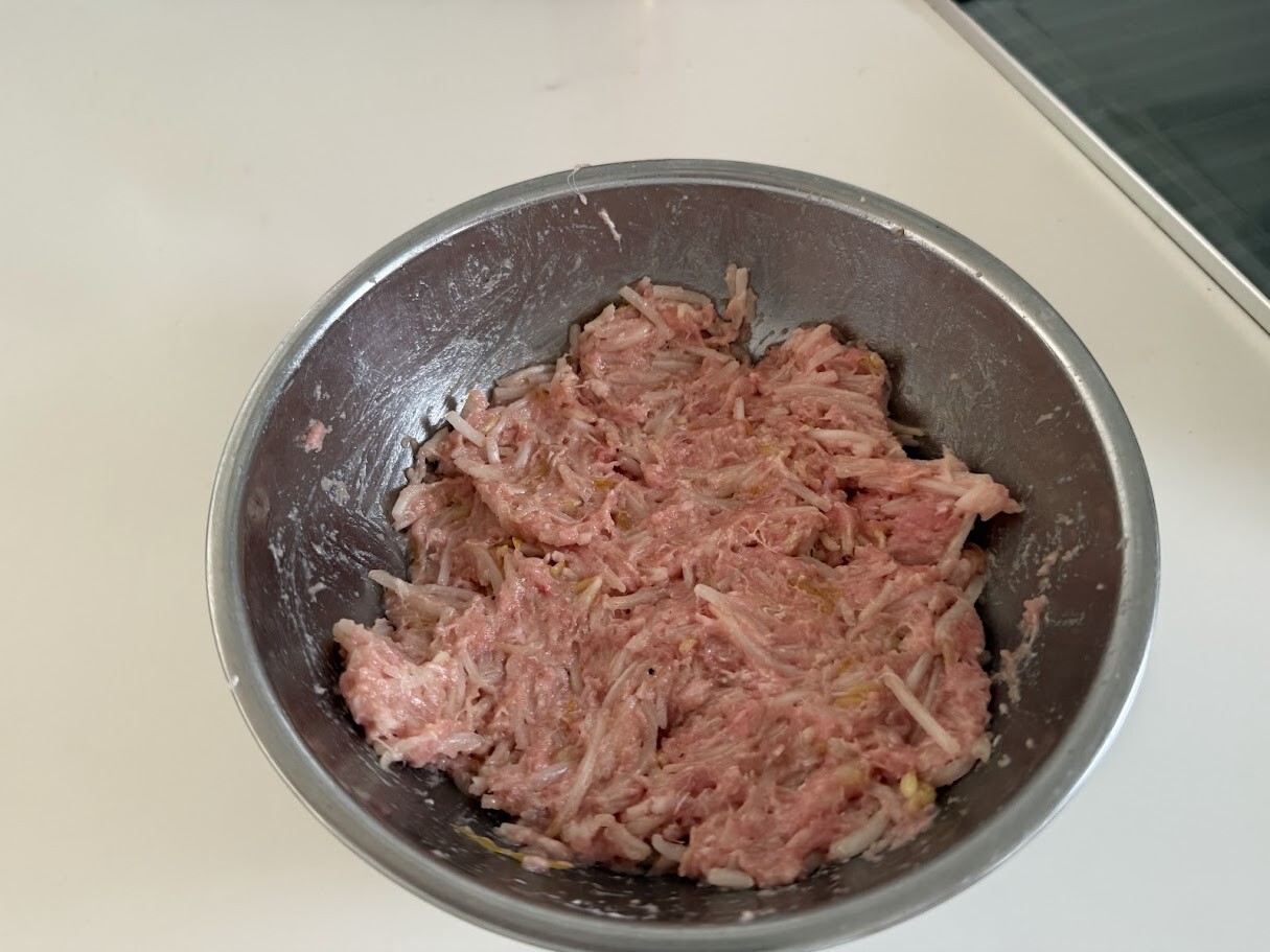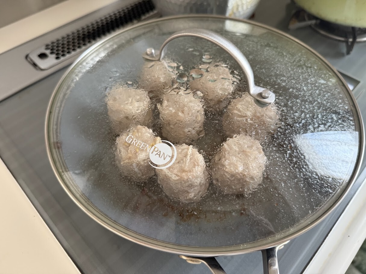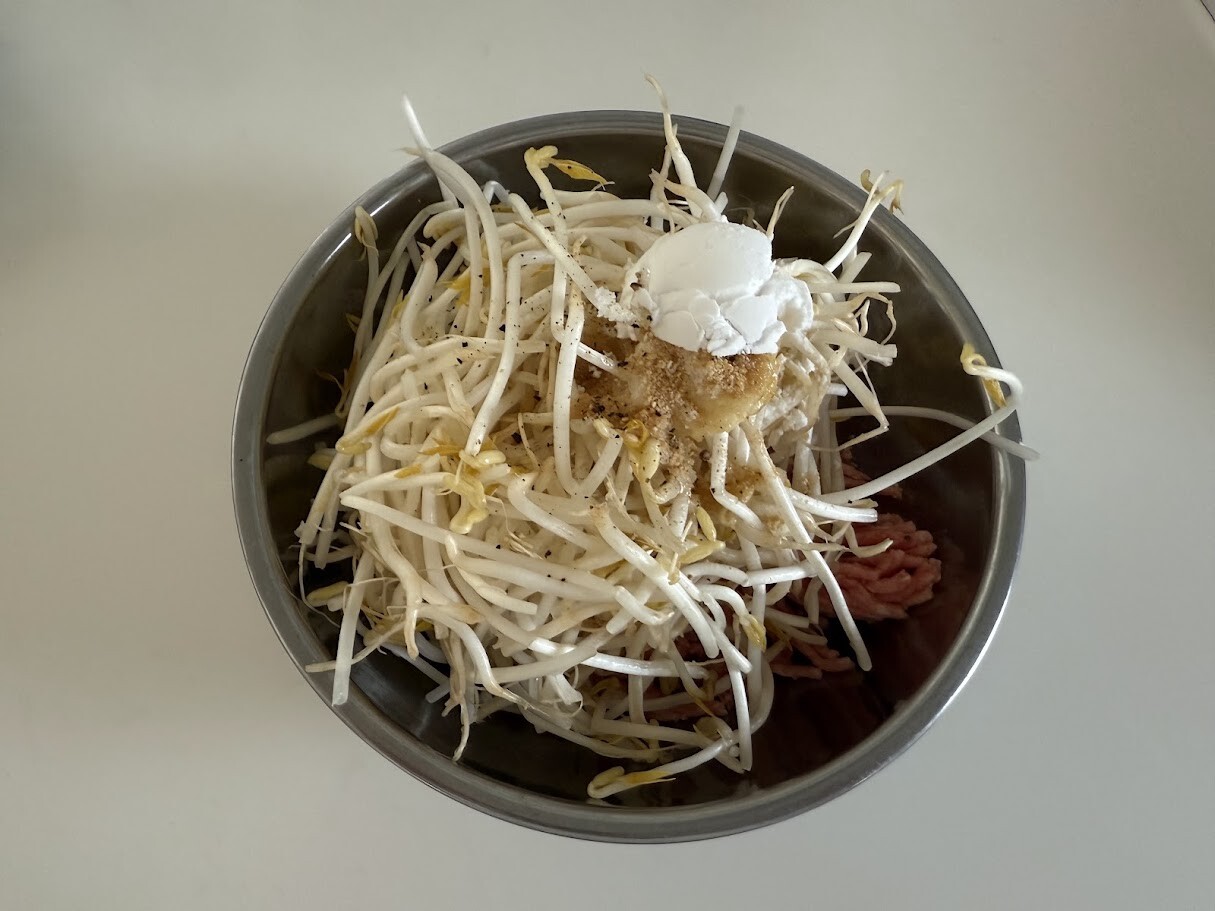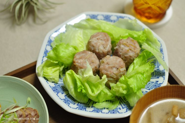いかにもシュウマイですけど?みたいな顔をして並べられていますが、シュウマイの皮は使っていなくてしかも2人前でもやしを1袋使っているという、意外にヘルシーなシュウマイ風の肉団子。