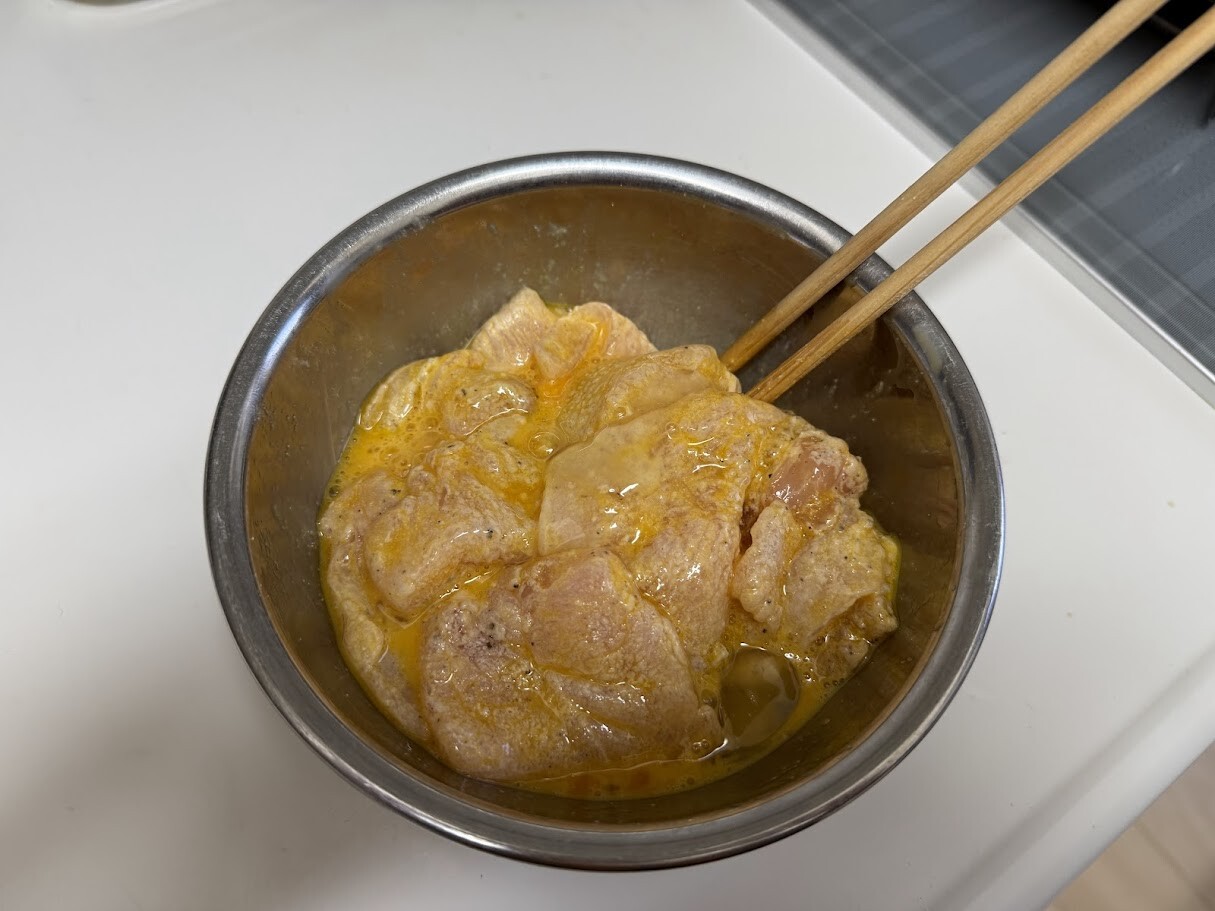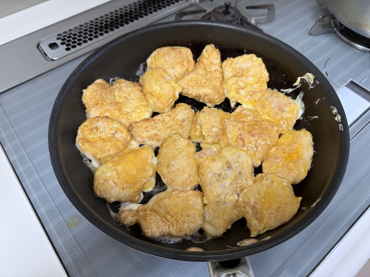 そぎ切りにしたむね肉に、塩、胡椒をまぶして薄力粉を振り、卵を絡めて・・・