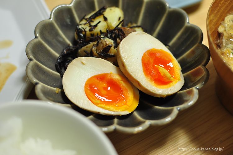 週末試作していたゆで卵を使って味付き卵と、ひじきのベーコン炒めのポテトサラダ。