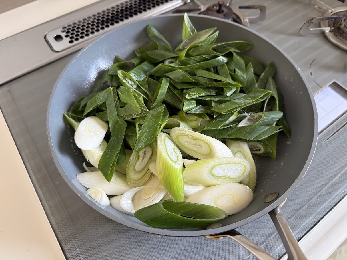 ここにネギを広げて入れて、じっくり焼いていきます。