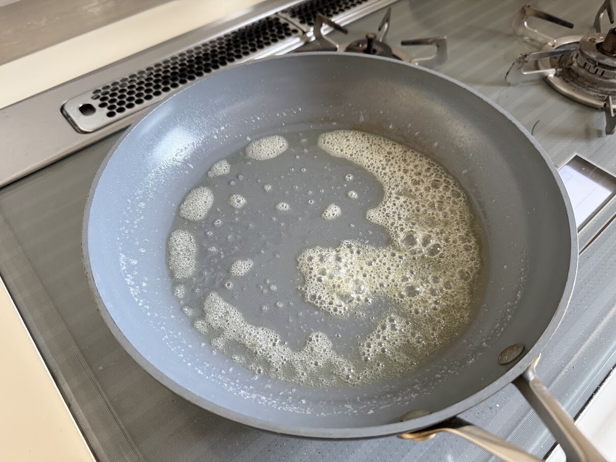 2)フライパンを中火にかけてあたため、バターを溶かす。長ネギを広げて入れ、5分ほど焼いて香ばしい焦げ目をつける。