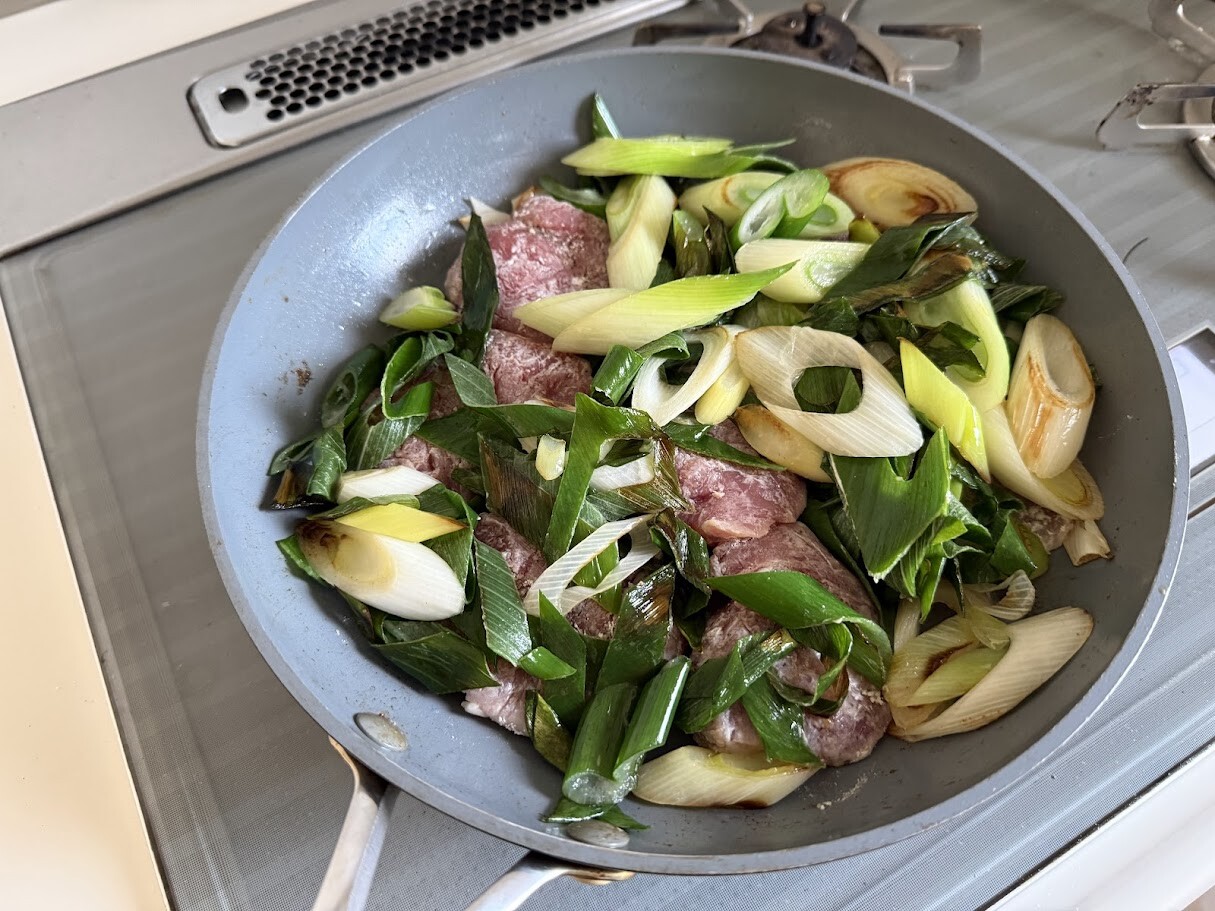 薄力粉をまぶした豚肉を並べ、ネギはその上に乗せちゃいましょう。