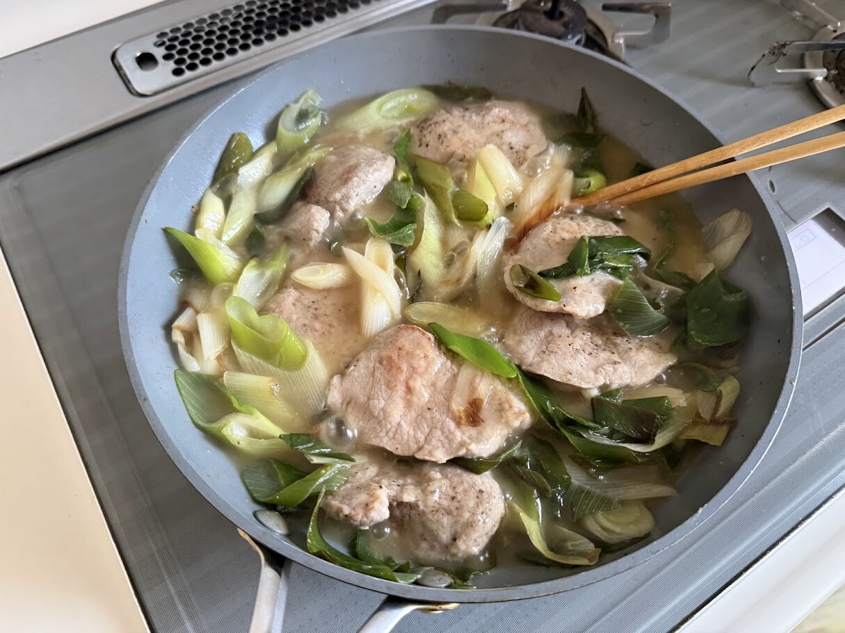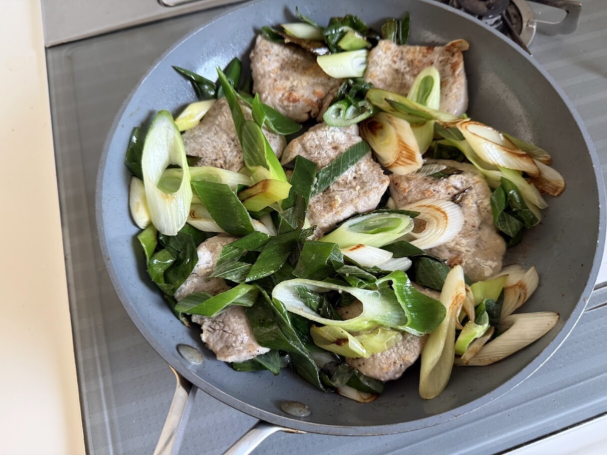 3)ネギを端に寄せて空いたところに豚肉を並べる。両面焼き色が付いたらネギを上にかぶせるように全体に広げ、水をそそぐ。中火から弱火くらいで5~6分ほど煮て豚肉の中まで火を通す。汁を味見して、足りなければ塩を一つまみ足す。