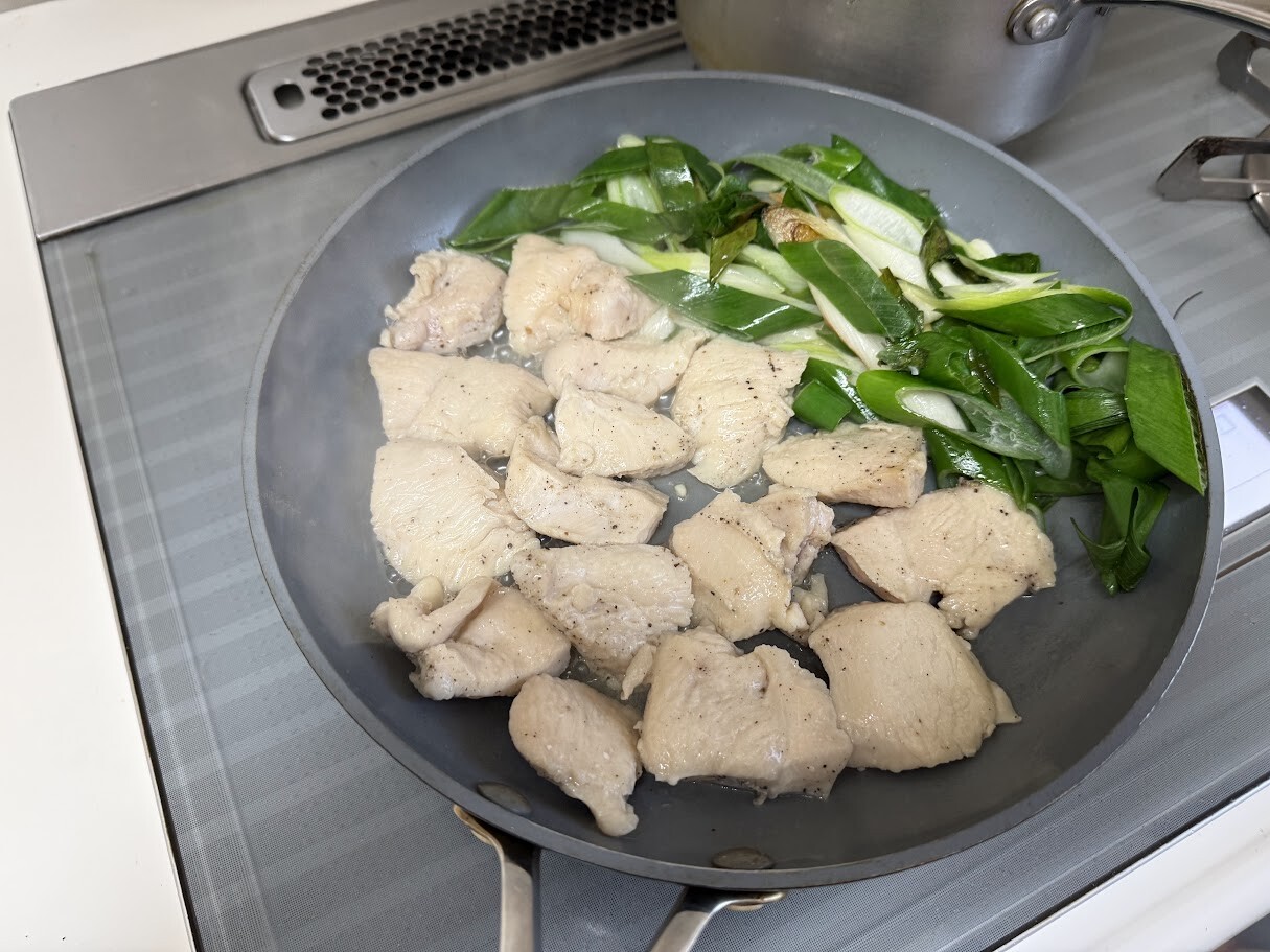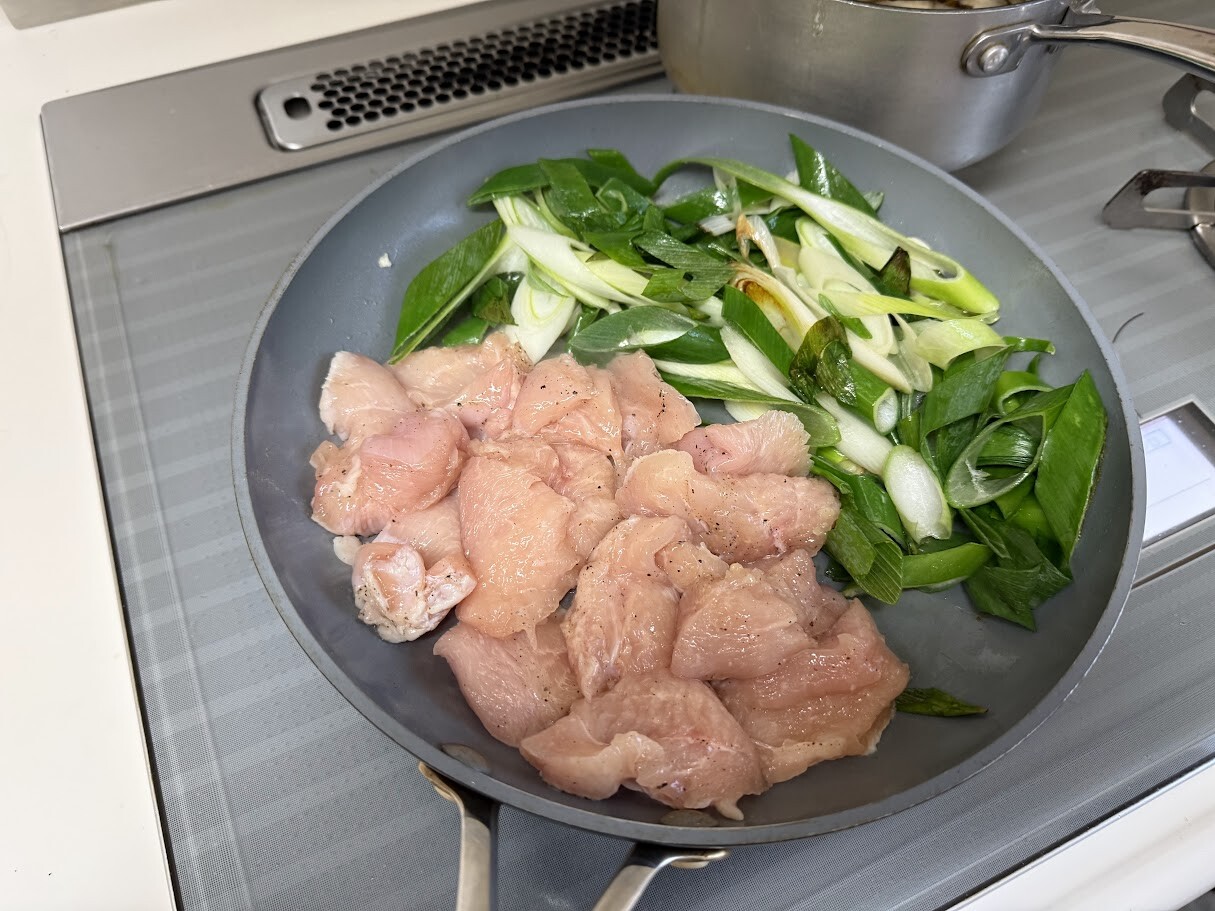 しっかり予熱しておいたフライパンにごま油を引いてネギを広げ、焦げ目をつけるようにして炒め、奥に押しやって空いたところで下味を揉みこんだ鶏肉を焼いていきます。