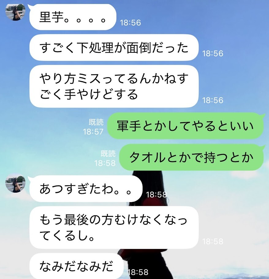 里芋の皮むきにかなり苦戦したようで、涙のLINEが送られてきました。