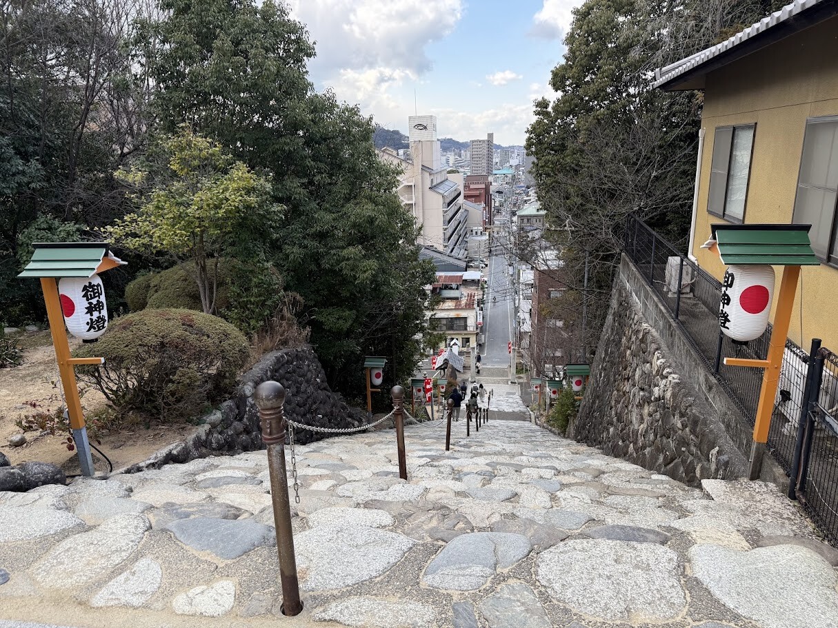 お茶のあとは、昨日駅に着いたときに遠くに見えていた急な石段を登ってみることにしました。