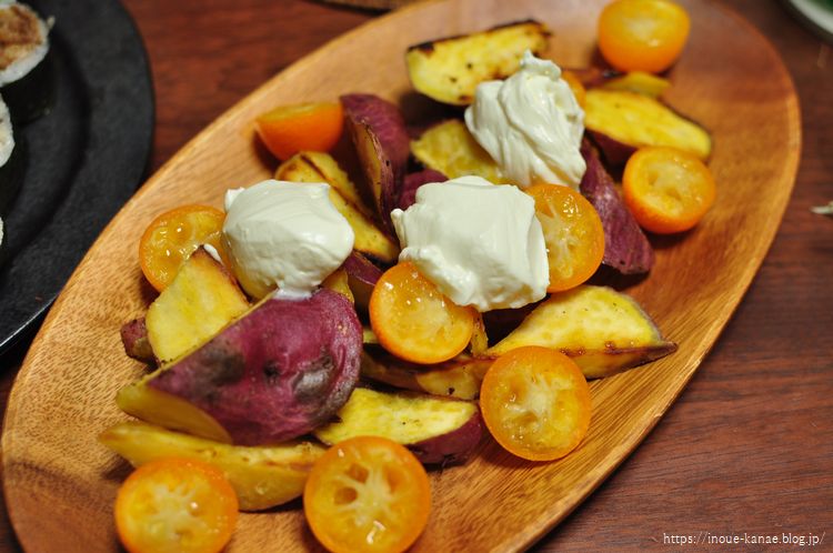 そしてあとはこないだちょっとだけ使って余っていたマスカルポーネを使ってしまいたくて、塩サツマイモを作り、ここに金柑のはちみつマリネとマスカルポーネをトッピングしたもの。