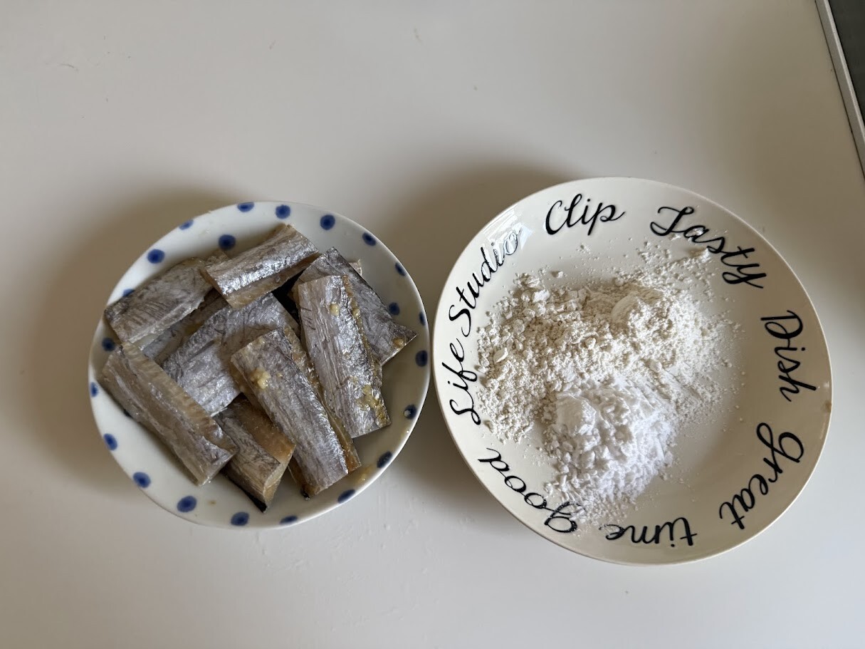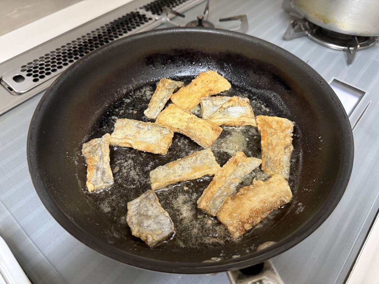 酒、醤油、ニンニクなどで下味を揉みこんだ太刀魚に、片栗粉と薄力粉を混ぜた衣をつけてフライパンで揚げ焼きにしただけ。