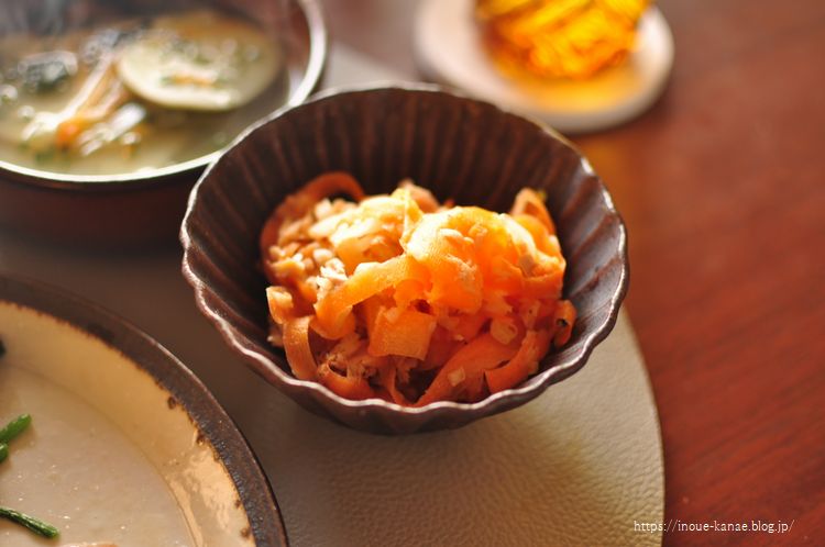 スライサーで薄くそいだにんじんと、みじん切りにして水にさらした玉ねぎ、汁気を切ったツナ缶を合わせて、塩、砂糖、米酢で和えたにんじんのツナサラダ。