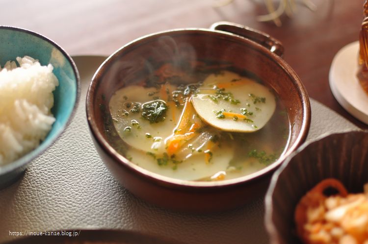 前夜の千切り野菜のスープに、薄切りの新じゃがとみじん切りのパセリを加えたスープ。
