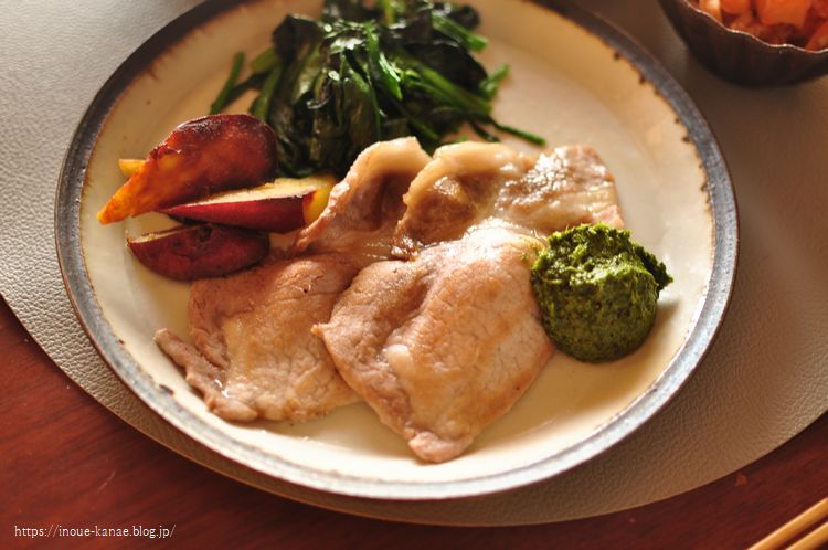 昨日の晩ごはんは、豚の生姜焼き用のお肉を塩、胡椒してさっと焼いて。